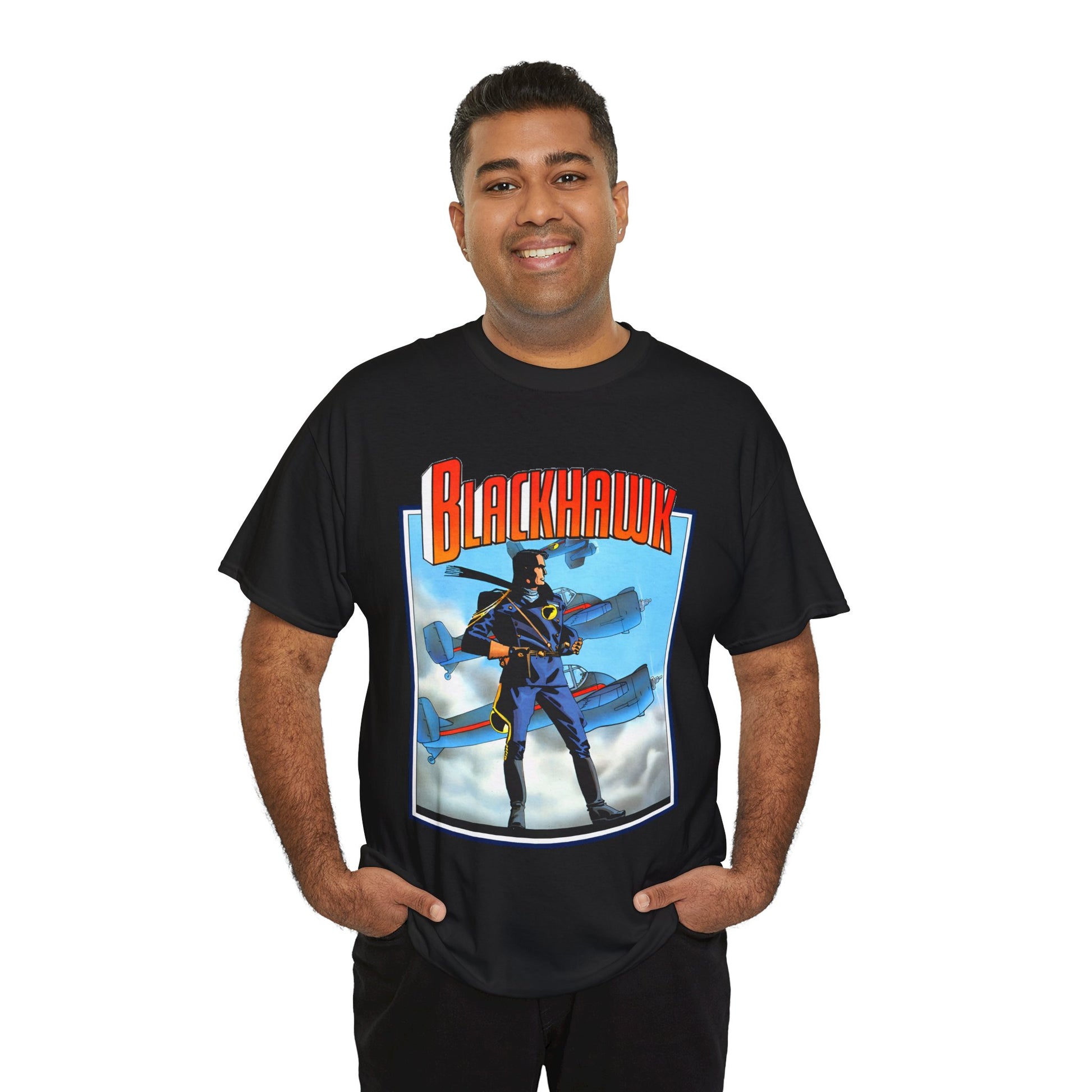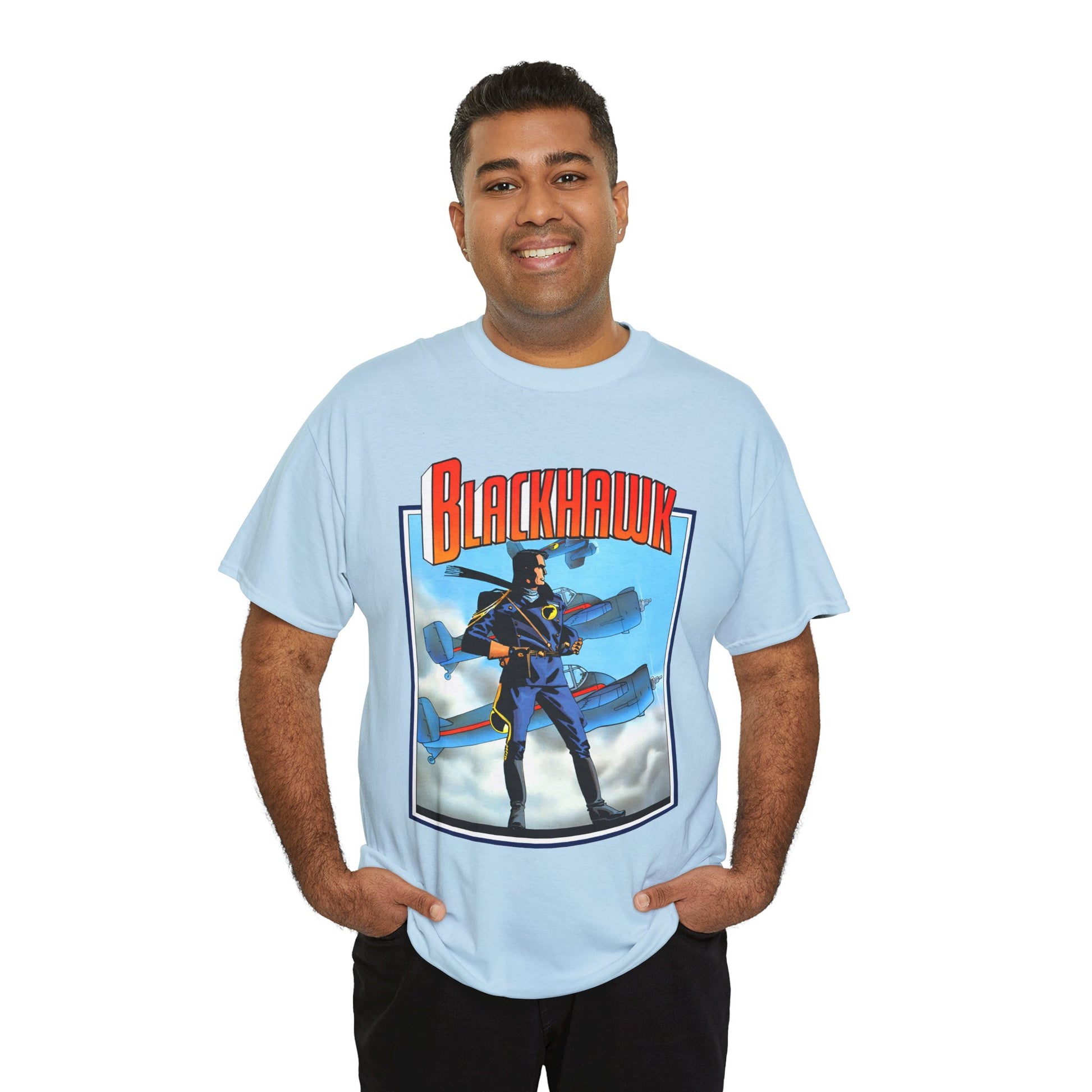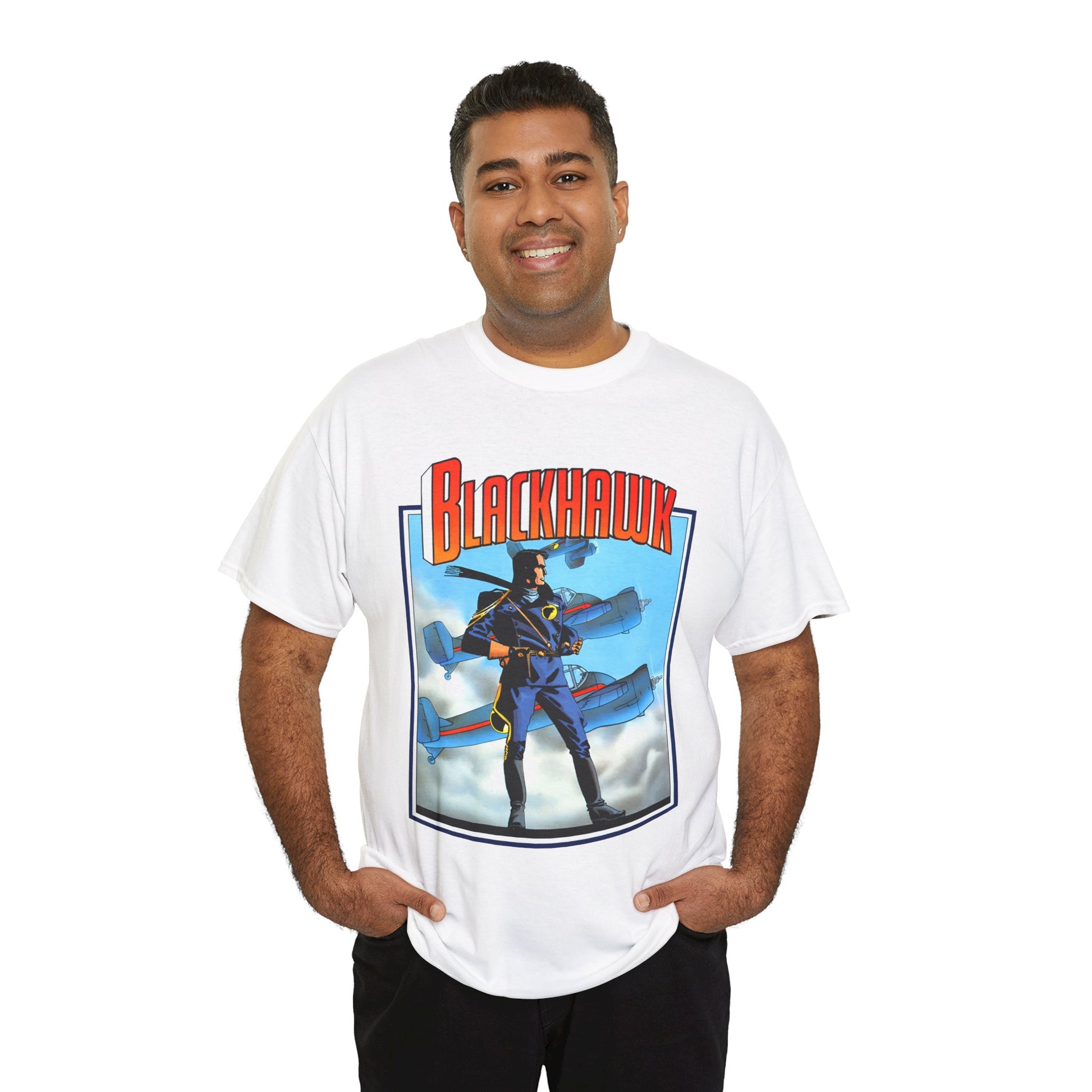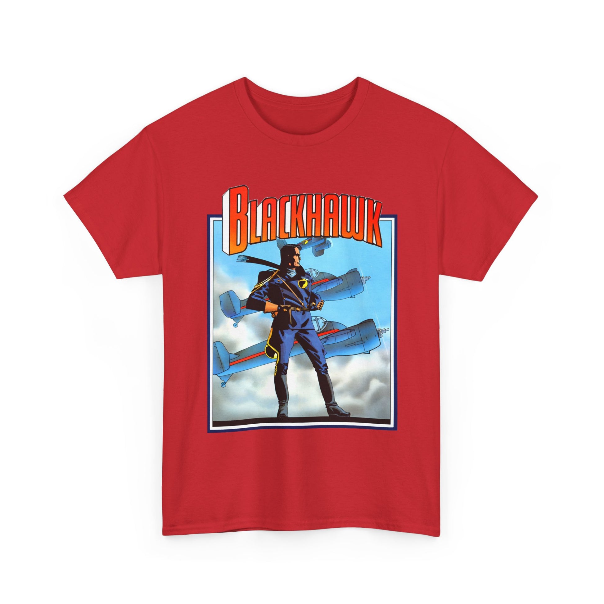 Celebrate legendary courage with the Blackhawk T-Shirt featuring iconic Howard Chaykin artwork. This design honors the fearless World War II anti-Nazi ace pilots from DC Comics, blending history and heroism in a striking graphic tee. Perfect for fans of classic comic art and wartime valor, it brings a powerful story to your everyday style.