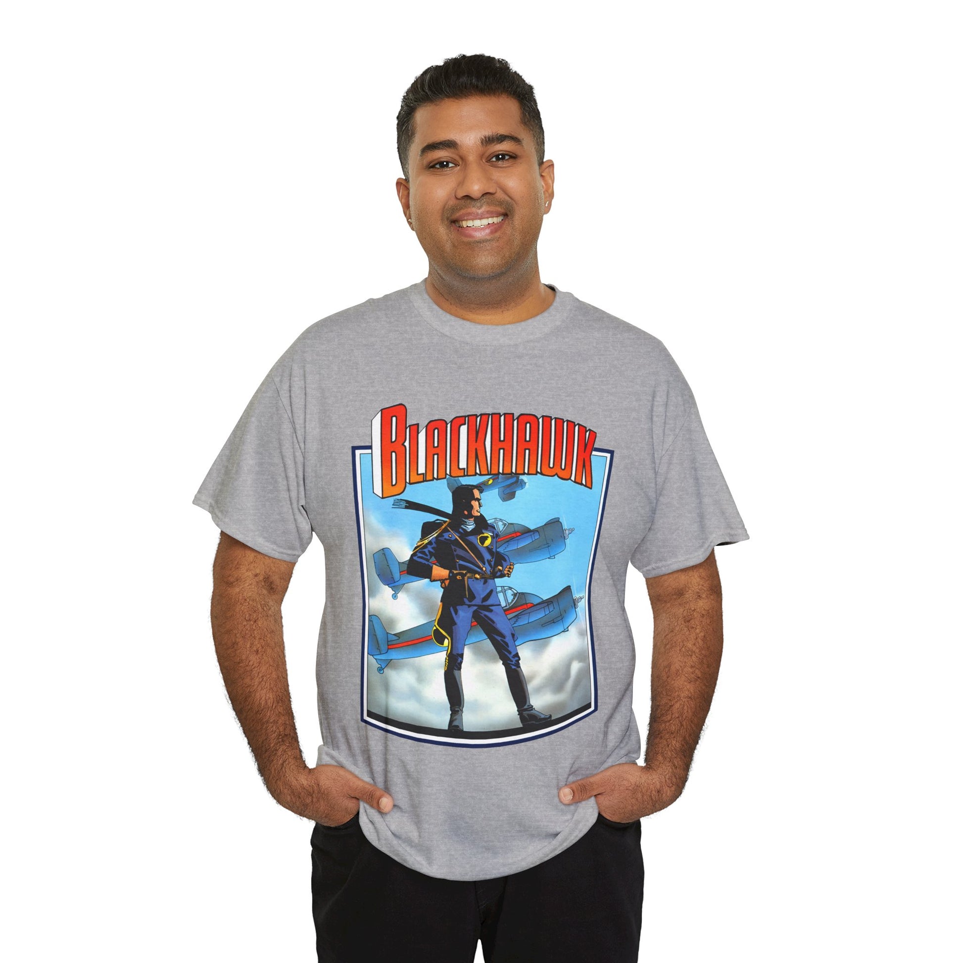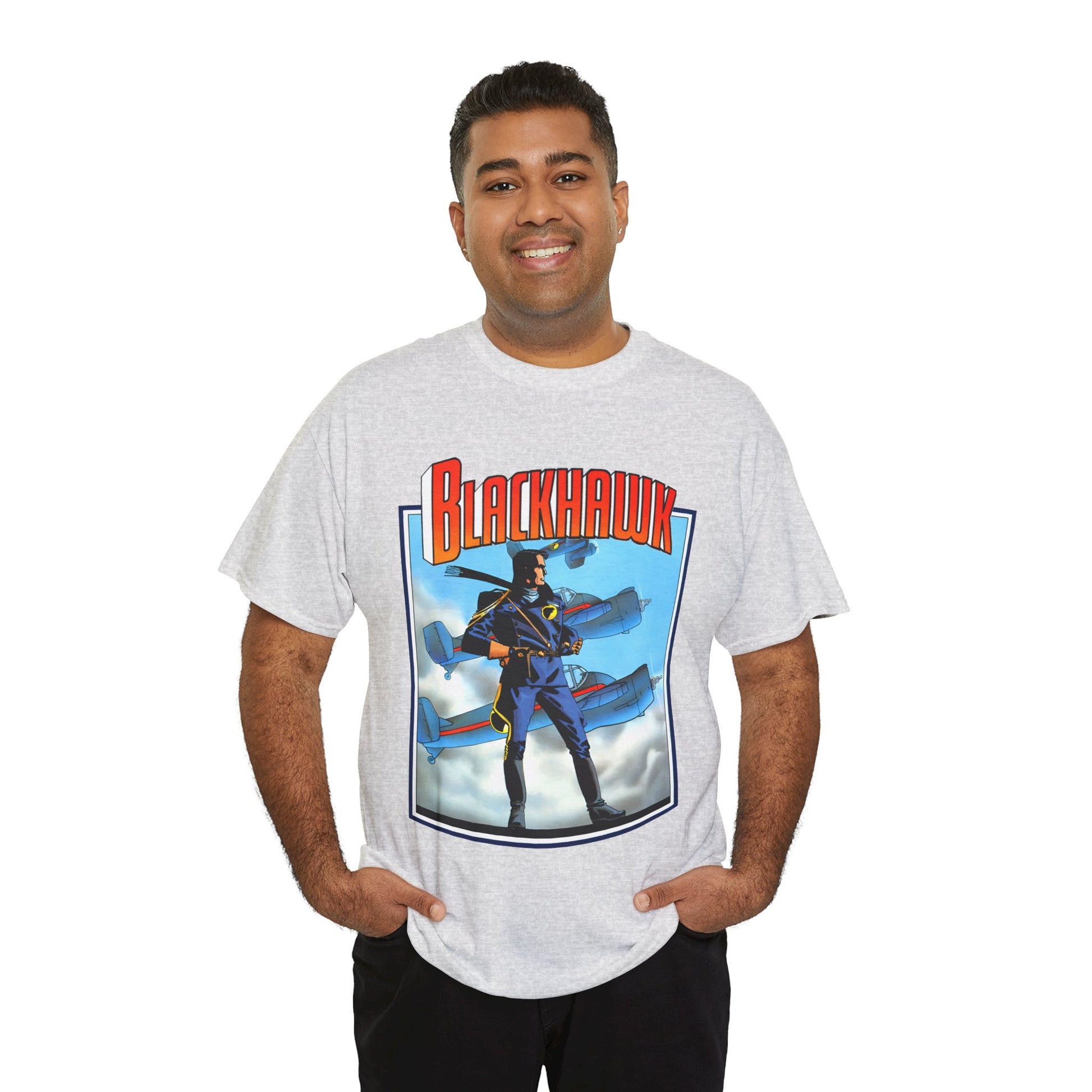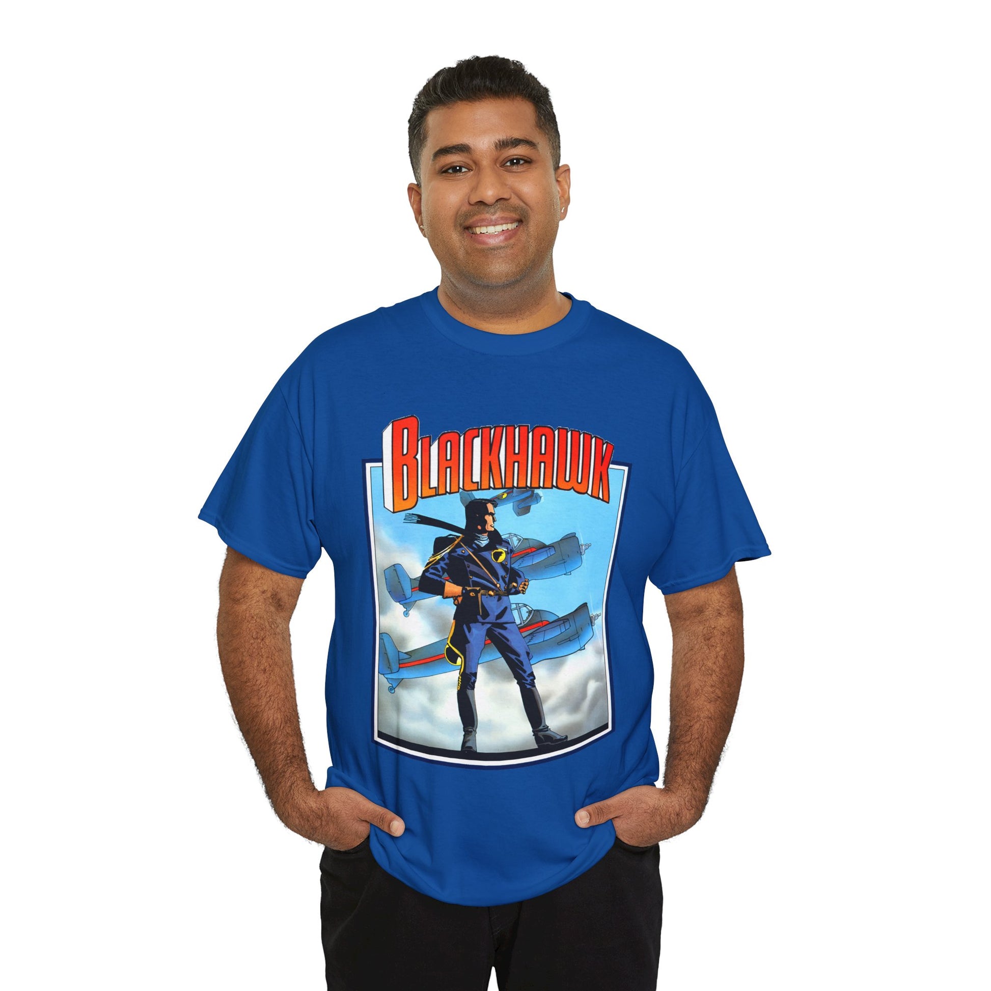Celebrate legendary courage with the Blackhawk T-Shirt featuring iconic Howard Chaykin artwork. This design honors the fearless World War II anti-Nazi ace pilots from DC Comics, blending history and heroism in a striking graphic tee. Perfect for fans of classic comic art and wartime valor, it brings a powerful story to your everyday style.