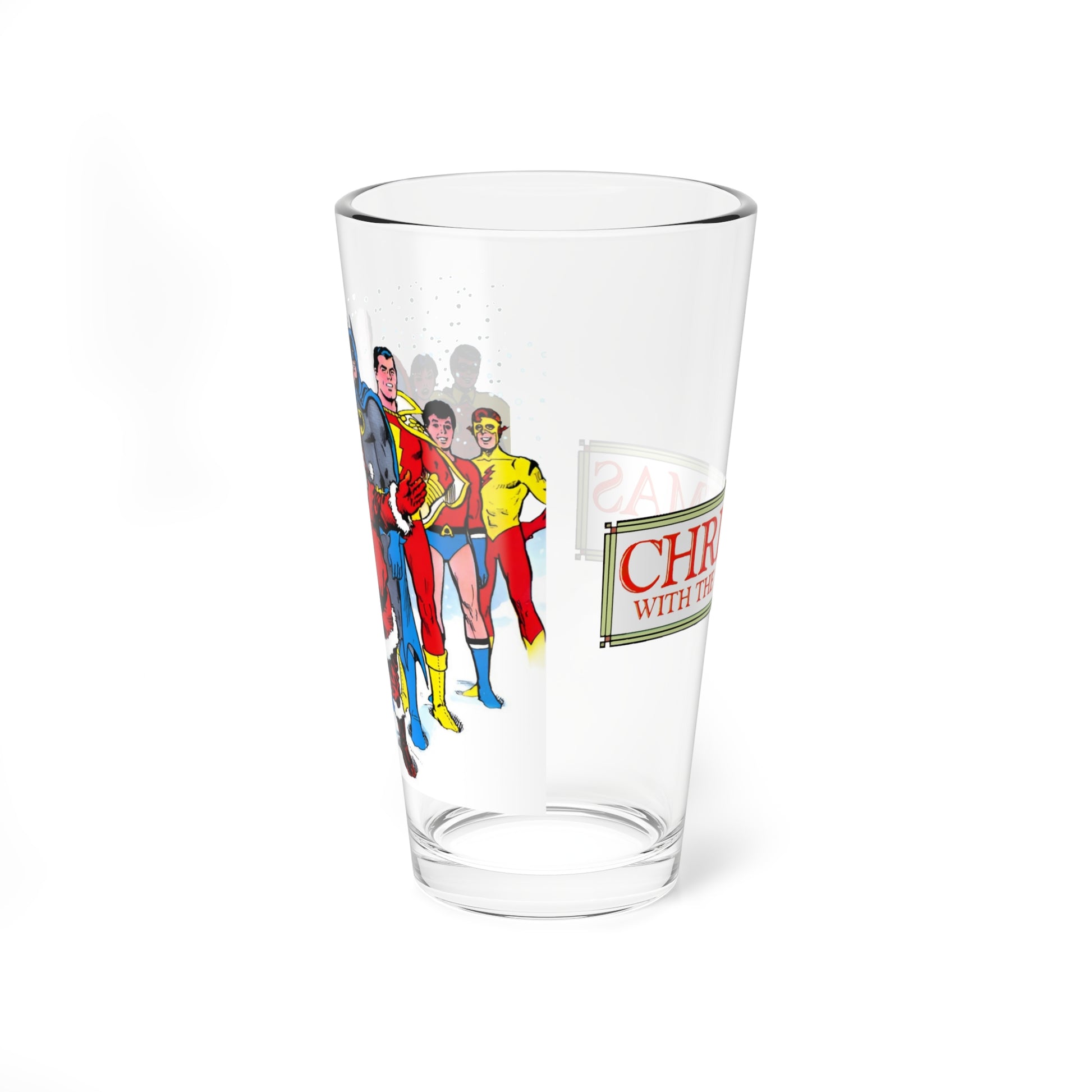 Raise a glass to the holidays with this festive 16oz pint glass featuring DC's mightiest heroes alongside jolly old Saint Nick himself! Superman, Batman, Captain Marvel, Robin, Wonder Girl, Kid Flash, and Aqualad join Santa in a cheerful Christmas celebration. Perfect for holiday parties, comic book fans, or anyone who loves mixing superhero flair with seasonal cheer. Whether you're sipping eggnog, hot cocoa, or your favorite beverage, this vibrant glass brings comic book magic and Christmas joy to every occasion. A unique gift that combines two beloved traditions into one fun, festive essential!