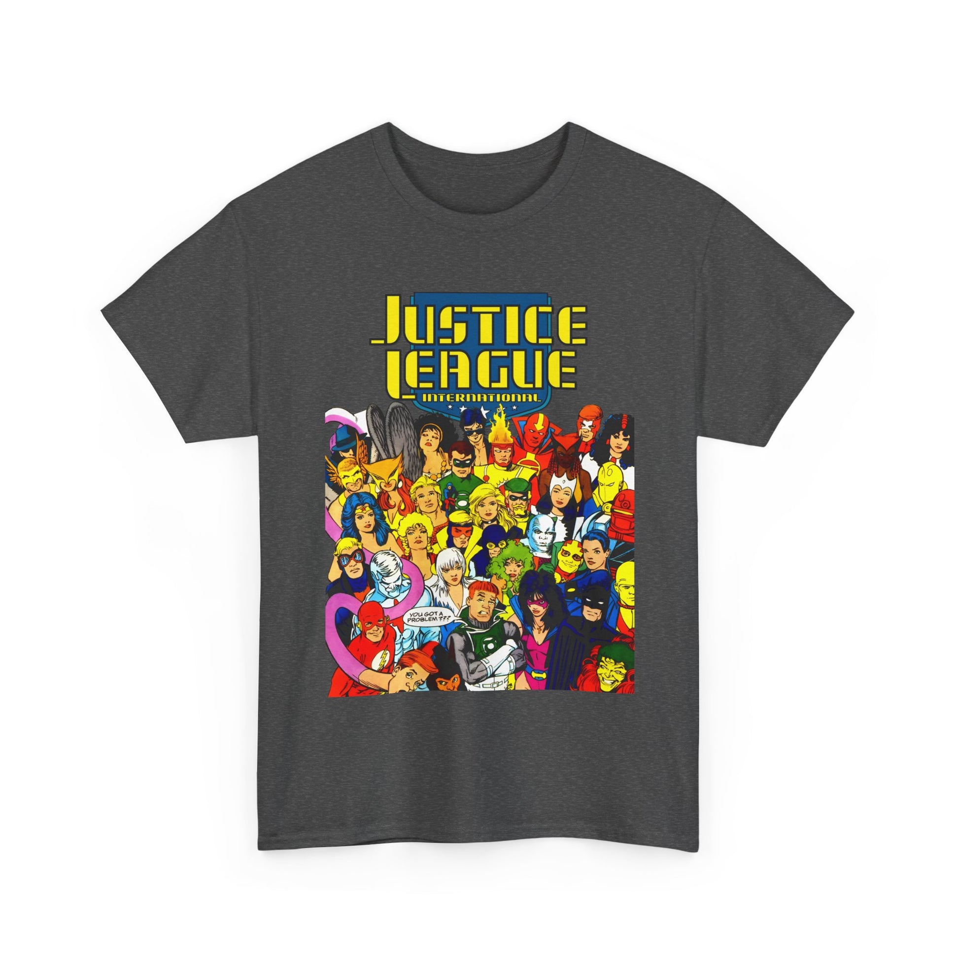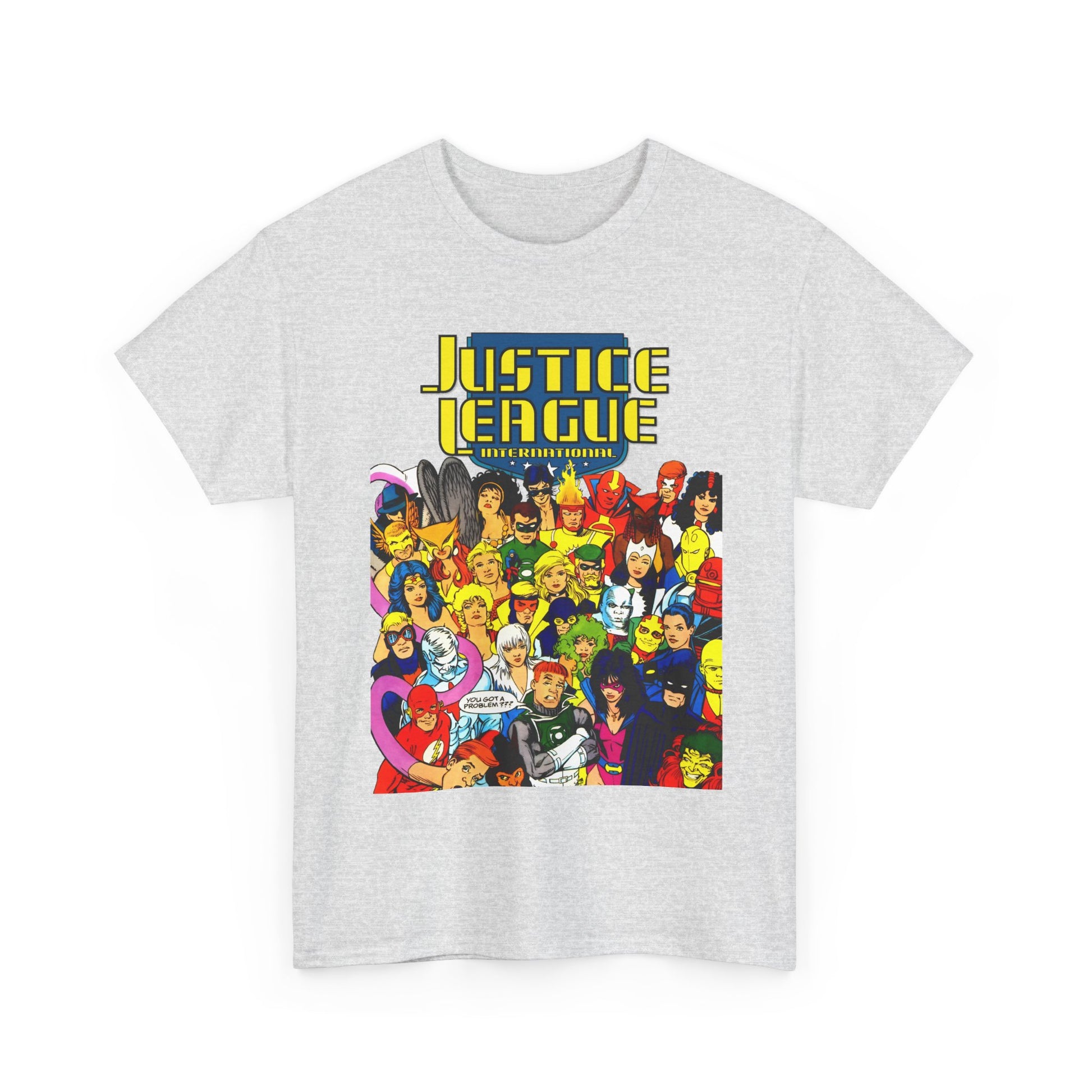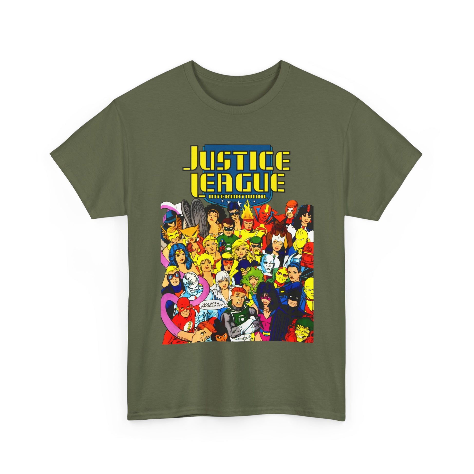 This 100% cotton graphic tee features Justice League International art by Kevin Maguire, perfect for any collector. It's in stock and ready to ship.