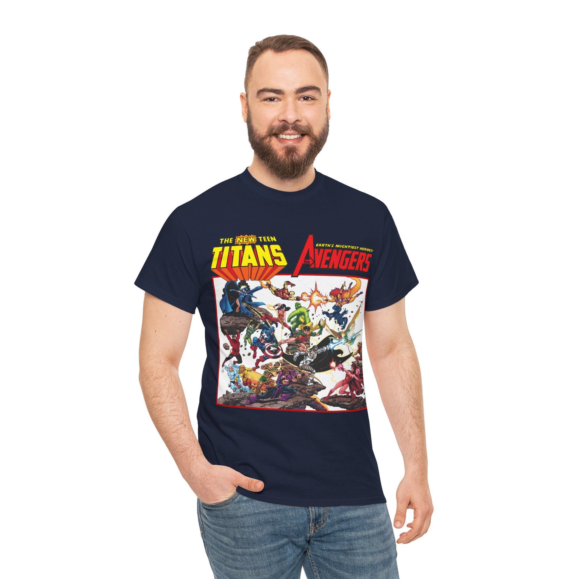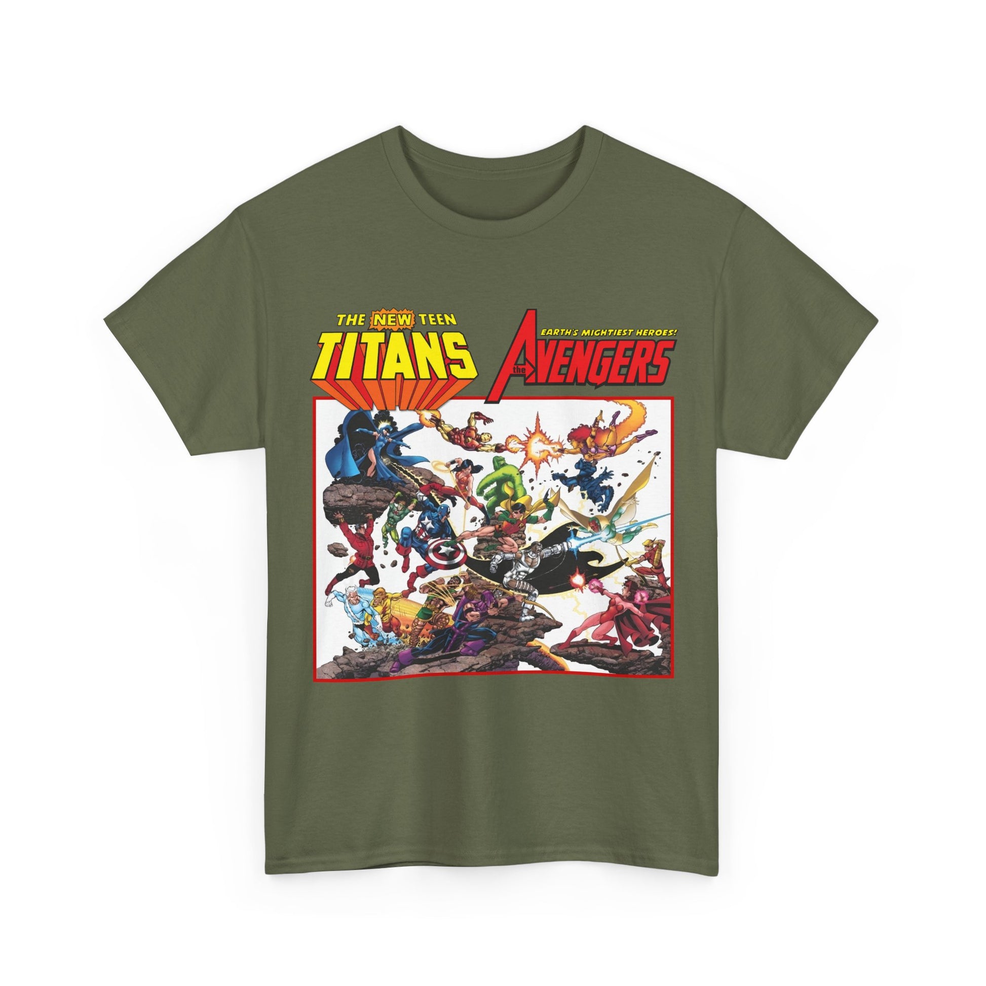 New Teen Titans Vs Avengers T-Shirt - George Perez Art - Hawkeye, Wonder Man, Raven, Starfire, Cyborg, Scarlet Witch, Wonder Girl - DC Comics & Marvel Comics
