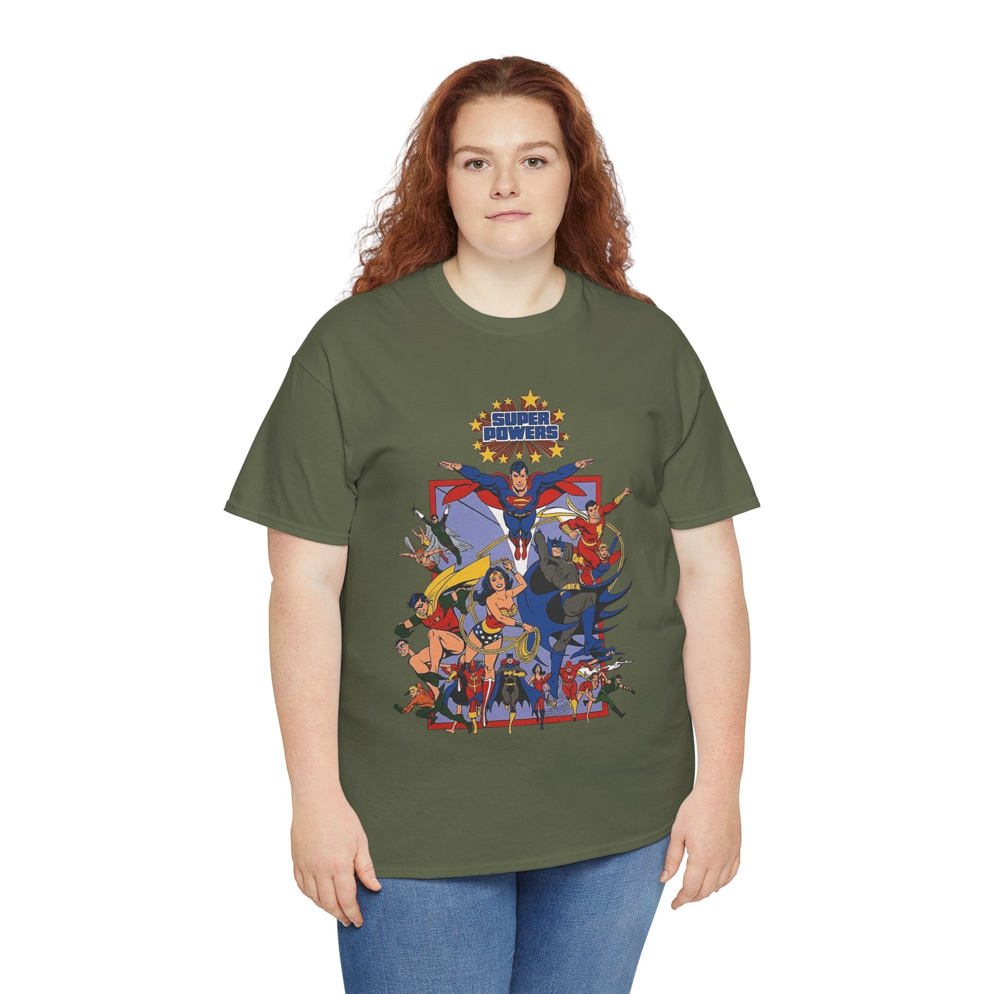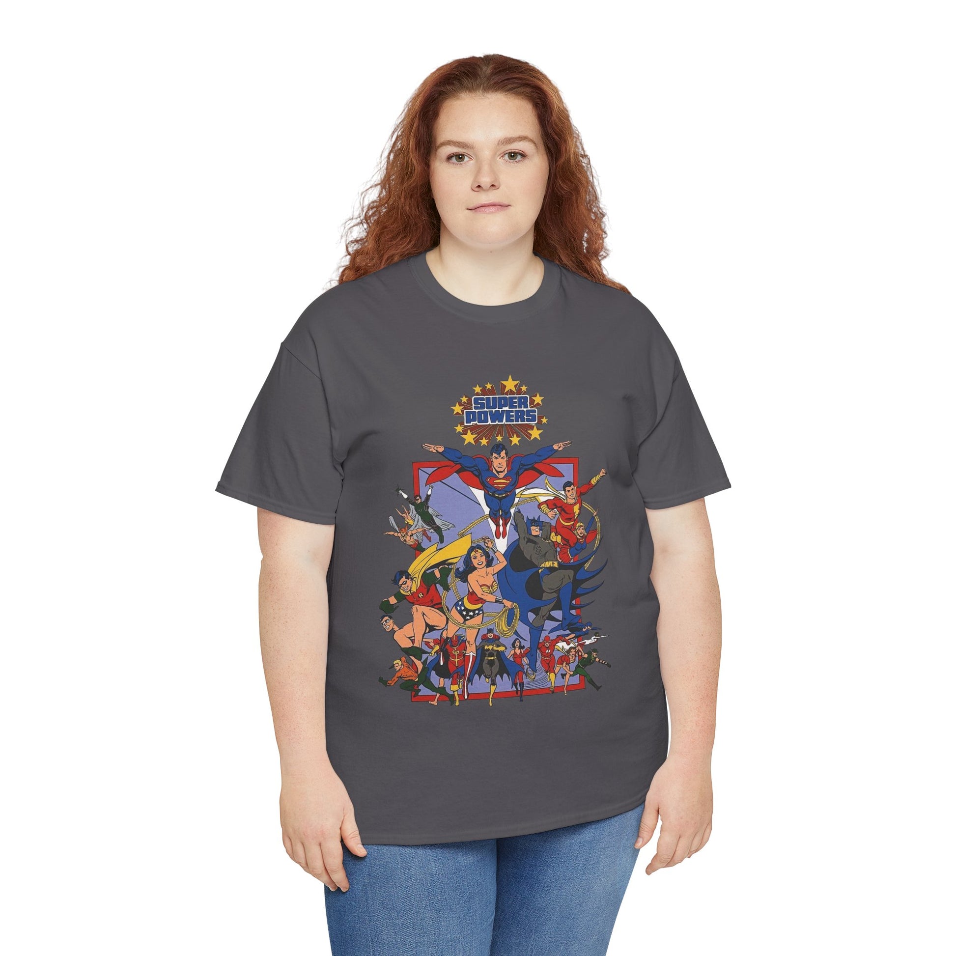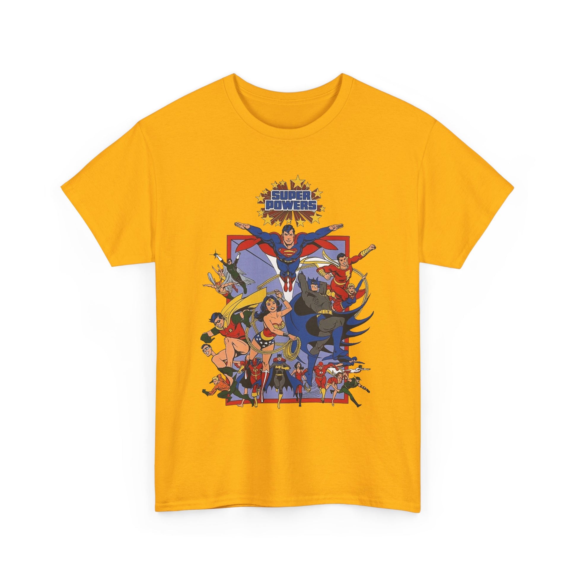 Super Powers T-Shirt - Superman, Flash, Wonder Woman, Batman, Batgirl, Robin, Plastic Man, Aquaman, Hawkman, Supergirl - 1980s Kenner Toy Line - Retro DC Comics